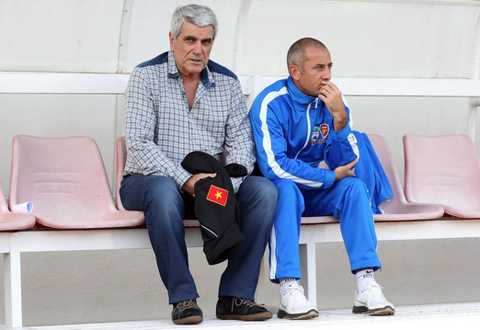 | Ông Jean Marc Guillou, giám đốc JMG toàn cầu trò chuyện cùng HLV Graechen của HAGL. (Ảnh: Minh Trần) |