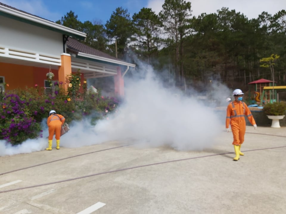 Lực lượng chức năng phun thuốc khử trùng ở Lâm Đồng.