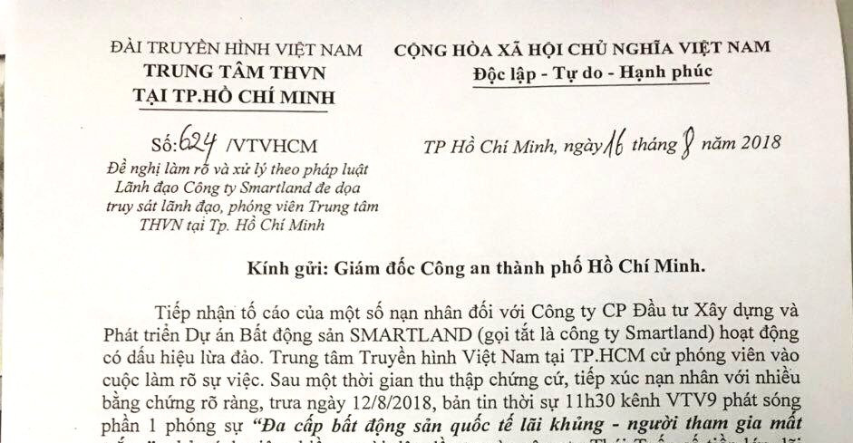 Văn bản của Giám đốc Trung tâm THVN tại TP.HCM gửi Công an TP.HCM đề nghị làm rõ và xử lý theo pháp luật việc lãnh đạo Công ty Cổ phần Đầu tư Xây dựng và Phát triển dự án Bất động sản Smartland (Công ty Smartland) đe doạ sẽ truy sát lãnh đạo, phóng viên của Trung tâm này.