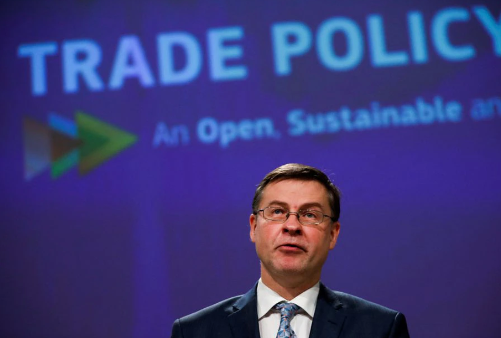 Ủy viên Châu Âu về Nền kinh tế Valdis Dombrovskis, theo dõi trong cuộc họp báo trực tuyến về chính sách thương mại Châu Âu tại trụ sở Ủy ban Châu Âu ở Brussels, Bỉ. (Ảnh: Reuters)