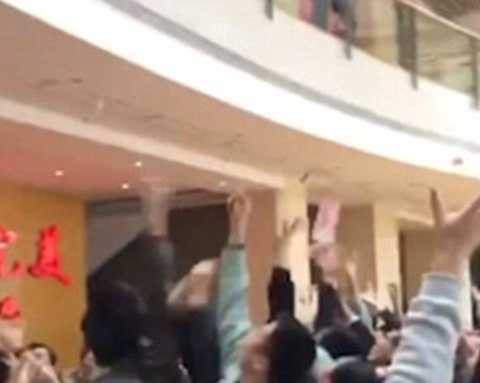 Trong đoạn clip, vị giám đốc đang tung các tờ tiền 100 nhân dân tệ màu đỏ xuống sảnh phía dưới. Trong khi đó, hàng trăm nhân viên đang hướng mắt lên trên và giơ tay để bắt.