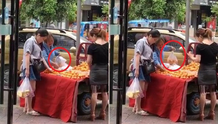 Lợi dụng lúc nữ khách hàng không để ý, người bán hàng nhanh tay tráo túi hoa quả do khách tự tay lựa với chiếc túi được chuẩn bị sẵn từ trước.