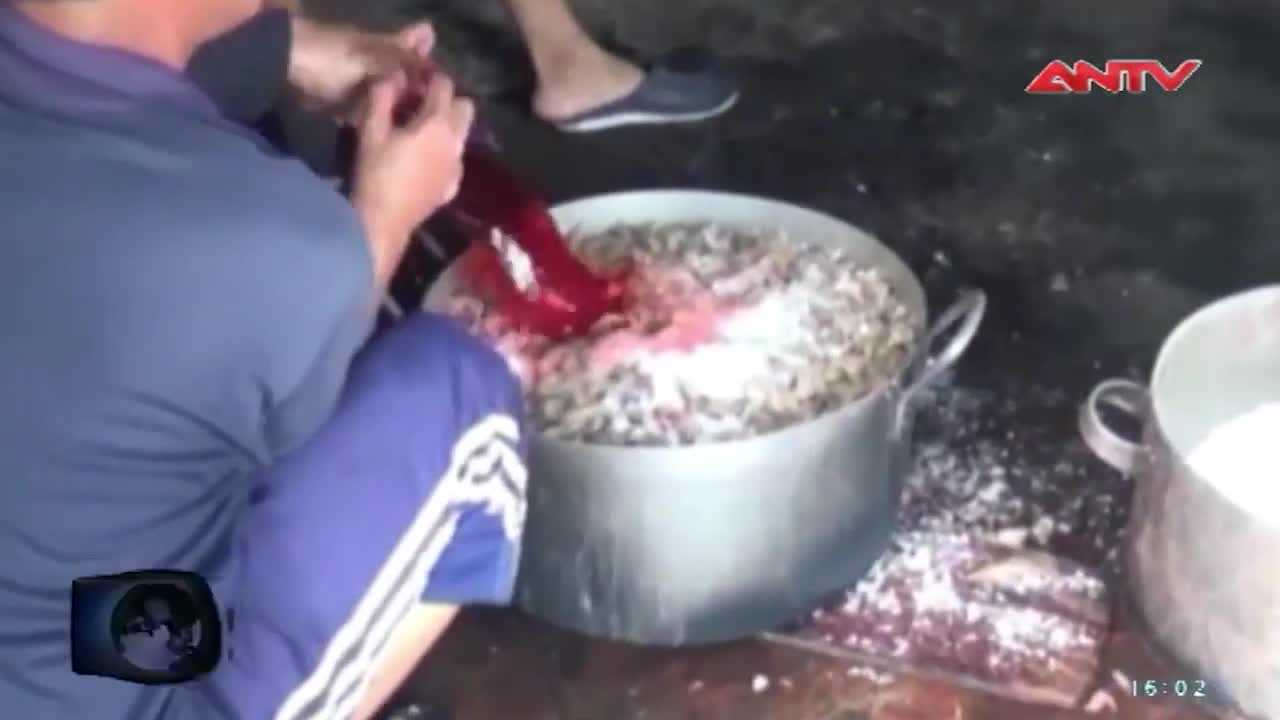 Tại thời điểm kiểm tra, cơ quan chức năng phát hiện tại nơi sơ chế tôm có 2 hộp đựng phẩm màu đỏ gạch và đỏ hồng không có nhãn hiệu, bên cạnh là một thùng nước phẩm màu đã pha sẵn để nhuộm tôm.