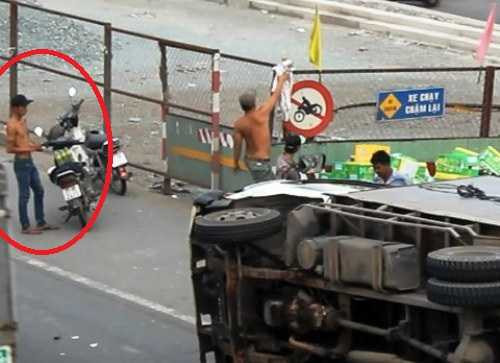 Đáng nói, dù lực lượng CSGT đang có mặt để giải quyết vụ tai nạn nhưng các đối tượng vẫn ngang nhiên lấy tài sản trước sự bất lực của người đi đường.