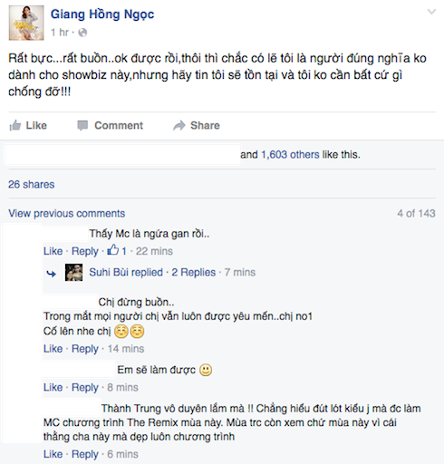 (VTC News) - Ngay sau màn trò chuyện thiếu duyên dáng của MC Thành Trung, Giang Hồng Ngọc đã chia sẻ một dòng trạng thái trên trang cá nhân thể hiện sự không hài lòng.
