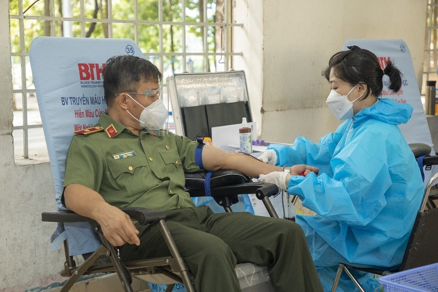 Thiếu tướng, PGS TS Phan Xuân Tuy, Bí thư Đảng ủy, Hiệu trưởng Trường Đại học An ninh Nhân dân tham gia hiến máu, động viên tinh thần cán bộ, chiến sĩ và đội ngũ y tế.