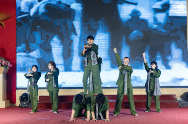 Màn biểu diễn nghệ thuật được sinh viên khoa Du lịch dàn dựng công phu từ các bài hát cách mạng trong thời chiến và những tác phẩm mang tinh thần yêu nước, dựng xây và sống cống hiến của thế hệ mới.