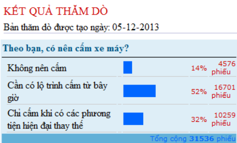Chuyên đề “Lộ trình cấm xe máy ở đô thị, cấp thiết lắm rồi” trên báo điện tử VTC News đã gây được tiếng vang lớn, thu hút sự chú ý của hàng triệu độc giả. Theo bạn, có nên cấm xe máy ở đô thị lớn? Cụ thể như sau: trong 31.533 phiếu, có tới 52% độc giả ủng hộ cần có lộ trình cấm xe máy từ bây giờ, trong khi 32% ủng hộ việc cấm xe máy khi đã có các phương tiện hiện đại thay thế. Chỉ có 14% bạn đọc phản đối đề xuất này. Xem ảnh chụp màn hình kết quả thăm dò dưới đây hoặc độc giả có thể nhấn vào nút "xem kết quả" ở mục thăm dò.