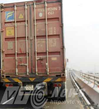 Khi lưu thông qua cầu vượt thép đến giữa cầu thì bất ngờ xuất hiện 1 chiếc xe container dừng đậu để sửa chữa phía trước.