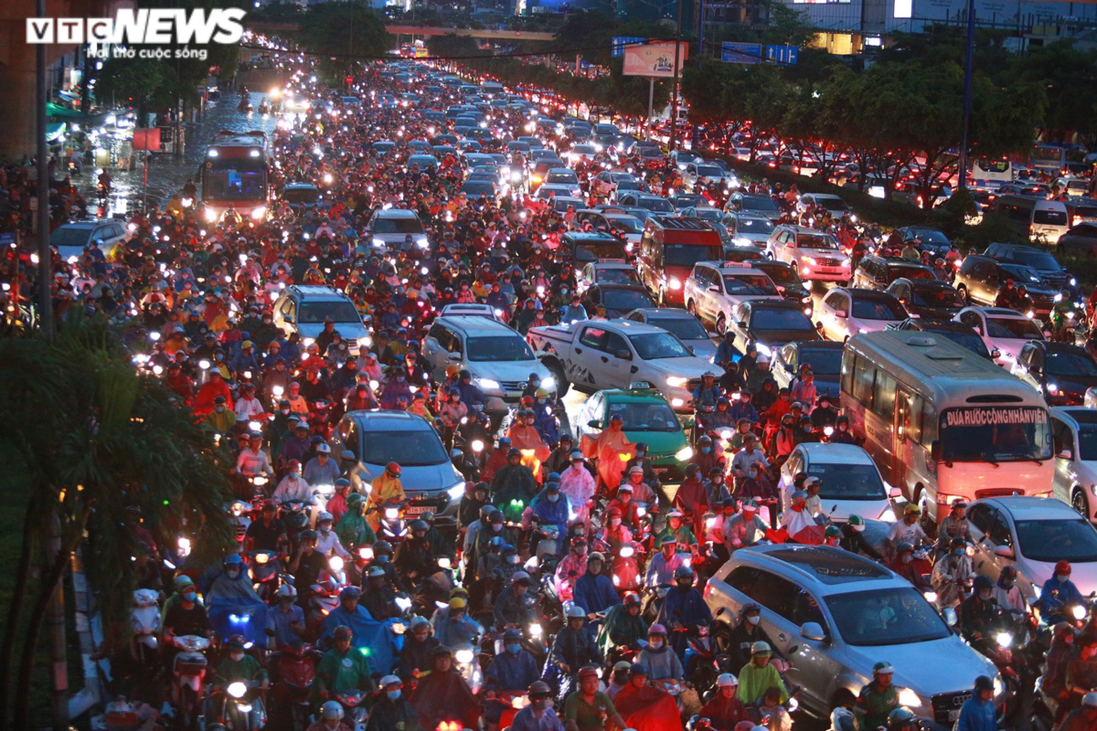 Dòng xe kẹt cứng trên đường Nguyễn Thái Sơn (quận Gò Vấp) sau trận mưa như trút nước đúng giờ tan sở.