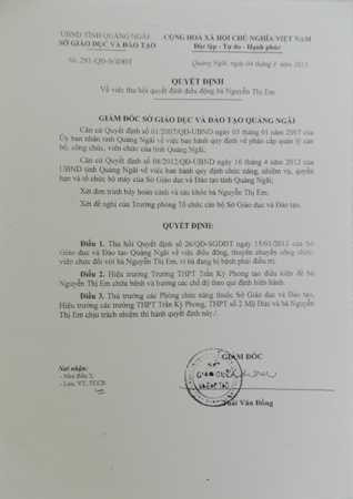 Quyết định của Giám đốc Sở GD&ĐT Quảng Ngãi thu hồi quyết định thuyên chuyển công tác đối với giáo viên Nguyễn Thị Em