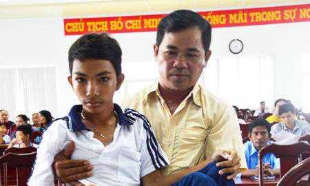 Tại một buổi lễ trao học bổng vừa được Hội Khuyến học huyện Châu Thành (tỉnh Sóc Trăng) tổ chức, nhiều người có mặt rất ngạc nhiên và xúc động khi chứng kiến hình ảnh một thầy giáo bế một em học sinh bị liệt hai chân lên sân khấu nhận học bổng.