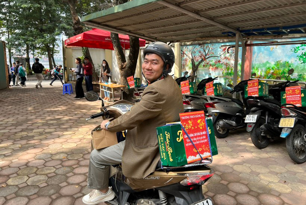 Thầy Nguyễn Ngọc Hân - giáo viên Toán (trường THCS Giảng Võ) vui mừng với phần quà trên xe.