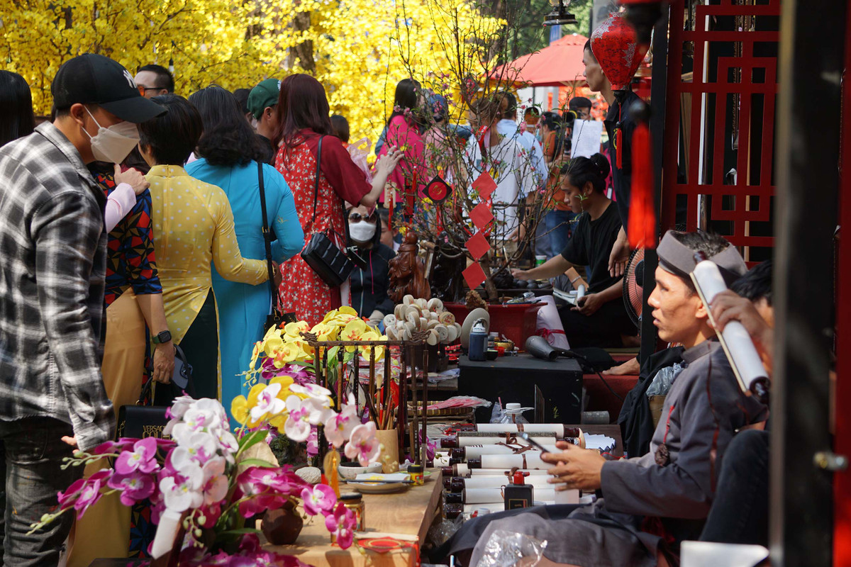 Tới đây, khách tham quan có thể bắt gặp những ông đồ trong tà áo dài truyền thống mải miết ngồi viết chữ trên giấy liễn, dưới mái lều được trang trí hết sức bắt mắt với hoa mai, hoa đào.