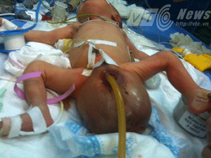 (VTC News) – Khối u phình to như một chiếc đầu khác với trọng lượng 0,5kg nằm phía hậu môn, giữa 2 chân của trẻ.