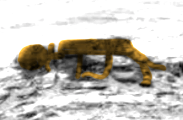 Hình ảnh này do NASA cung cấp, được tàu thăm dò Sao Hỏa Curiosity ghi lại. Khi phóng to hình ảnh, một hình dạng giống như người hiện ra rõ nét. “Người” này dường như có tư thế nằm sấp, đầu to, chân dài.
