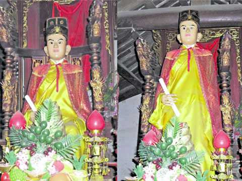 | Bức tượng Đức Linh Lang Đại vương có thể ngồi xuống (trái) và đứng lên (phải) |