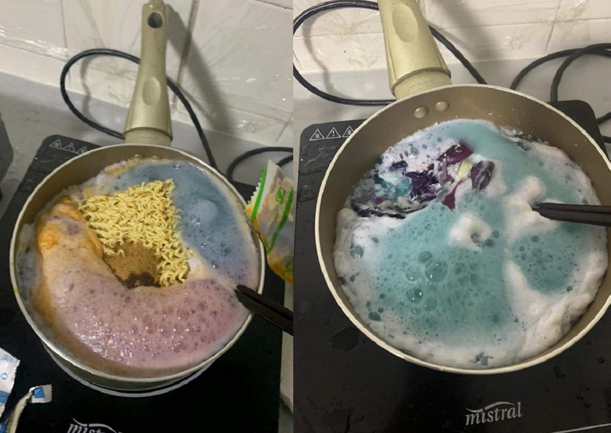 Không ai hiểu vì sao nấu mì trứng với bắp cải tím nhưng lại ra màu xanh như thế này.