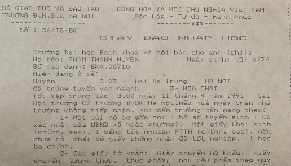 Chủ nhân của giấy báo nhập học có “tuổi đời” 31 năm này là chị Phạm Thanh Huyền (sống tại Hà Nội), hiện là giảng viên Trường ĐH Bách khoa Hà Nội.