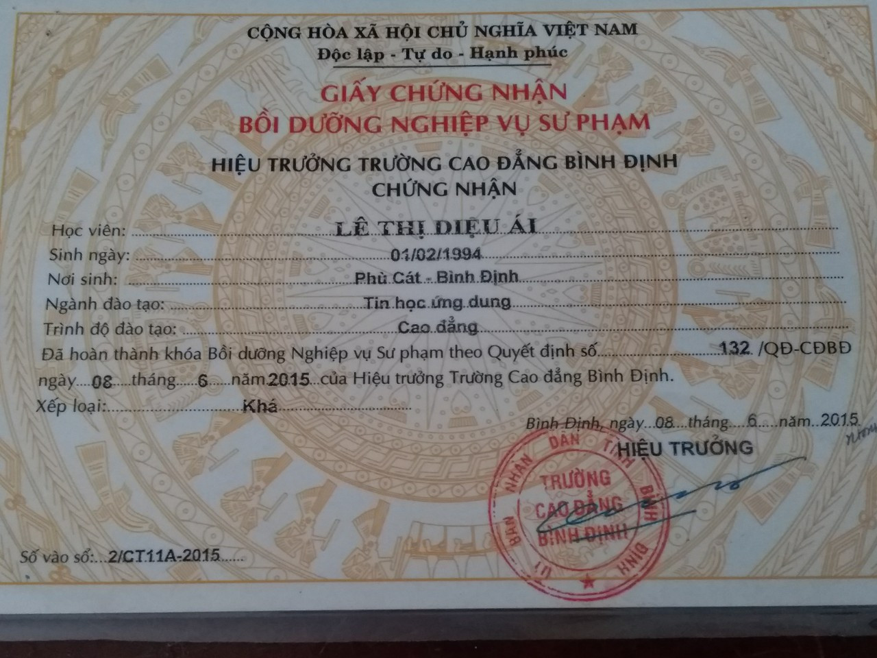Giấy chứng nhận bồi dưỡng nghiệp vụ sư phạm của chị Diệu Ái.