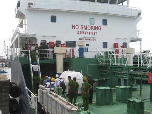 | Cơ quan chức năng lên tàu thu thập lời khai, khám nghiệm hiện trường. Ảnh: Hùng Anh |