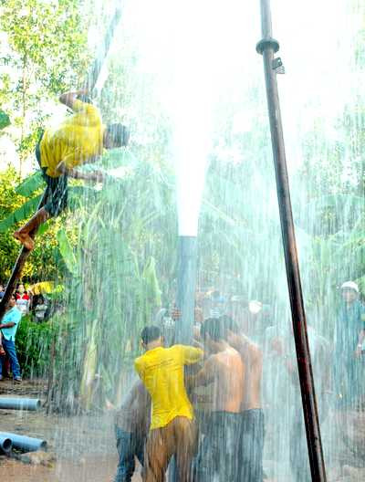 | Hàng chục người thay phiên nhau cắm ống xuống giếng khoan, khống chế 'vòi rồng'. Ảnh: Xuân Mai |