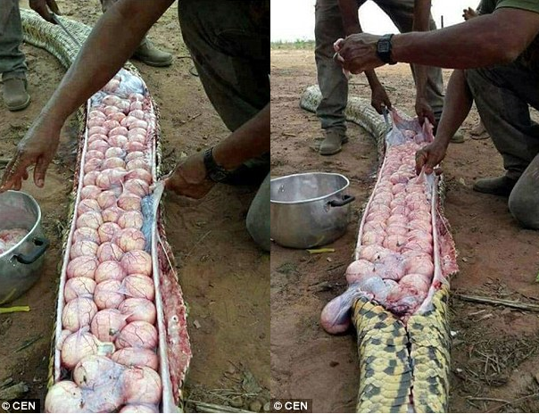Vì vậy, họ quyết định mổ bụng con trăn này để trừng phạt. Nhưng trên thực tế, con trăn này đang mang thai và kích thước của phần bụng là do số trứng mà nó mang trong bụng.