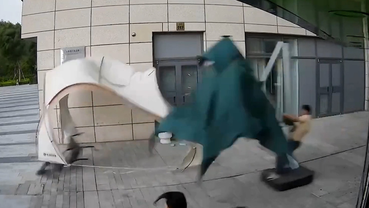 Bất chấp nỗ lực, cả việc đứng trên đế chiếc ô nhưng lực gió vẫn quá mạnh, kéo bay người đàn ông tại Lang Phường, tỉnh Hà Bắc, Trung Quốc.