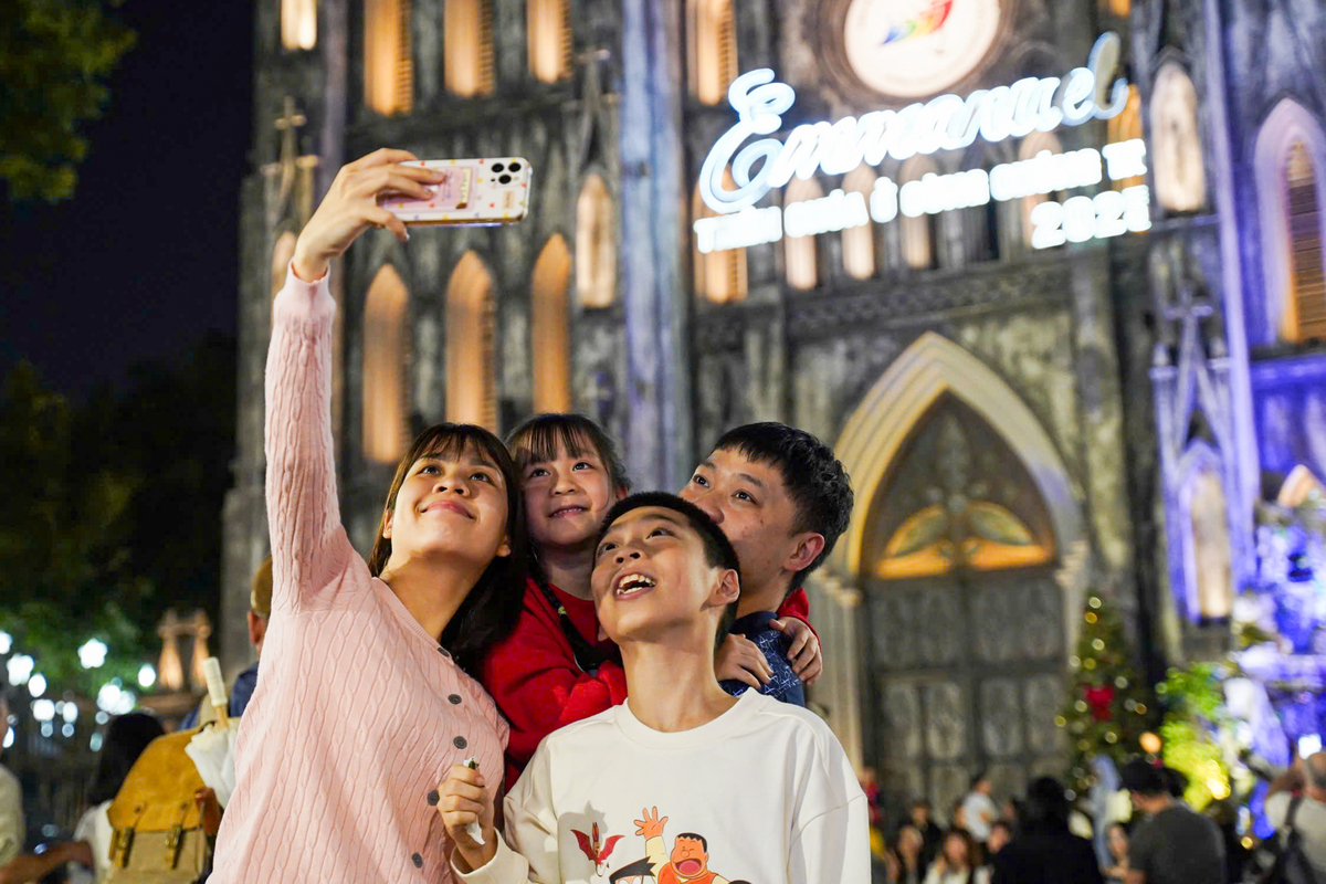 Khi màn đêm buông xuống, khu vực Nhà thờ Lớn thu hút đông đảo người dân đổ về, hòa mình vào không khí Giáng sinh sớm.
