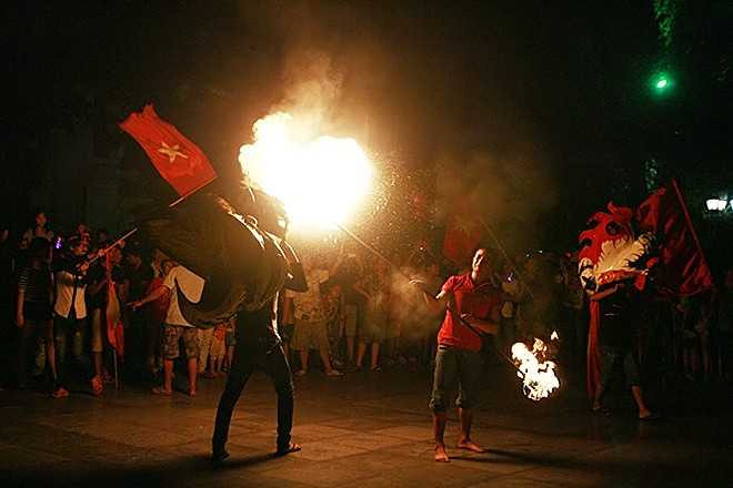 Dùng mũ bảo hiểm để xin tiền khi múa lân, nam thanh niên dùng cờ Tổ quốc chạy quanh phố... khiến không khí tết Trung thu ở thủ đô thêm náo nhiệt.
