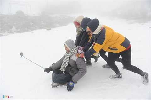10 sáng, tuyết đã dày lên đến 10 cm, tạo thuận lợi cho các bạn trẻ Việt Nam chơi trò chơi mà tưởng chỉ có ở các nước ôn đới: Trượt tuyết.