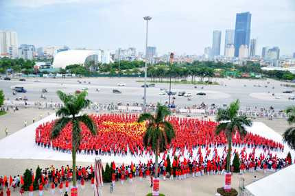 Đung đưa theo nhịp điệu của ca khúc “Lá cờ” của nhạc sĩ, ca sĩ Tạ Quang Thắng, hơn 4.000 bạn trẻ đã cùng nhau biểu diễn những tiết mục Flashmob càng khiến cho bầu không khí trở nên sôi động.Được biết, kỷ lục thế giới về xếp hình giọt máu khổng lồ đang thuộc về Hàn Quốc với 3.000 tình nguyện viên. Tại sân vận động Mỹ Đình, với sự tham gia của hơn 4.500 tình nguyện viên, hi vọng sẽ xác lập kỷ lục thế giới mới của chính các bạn trẻ Việt Nam. |