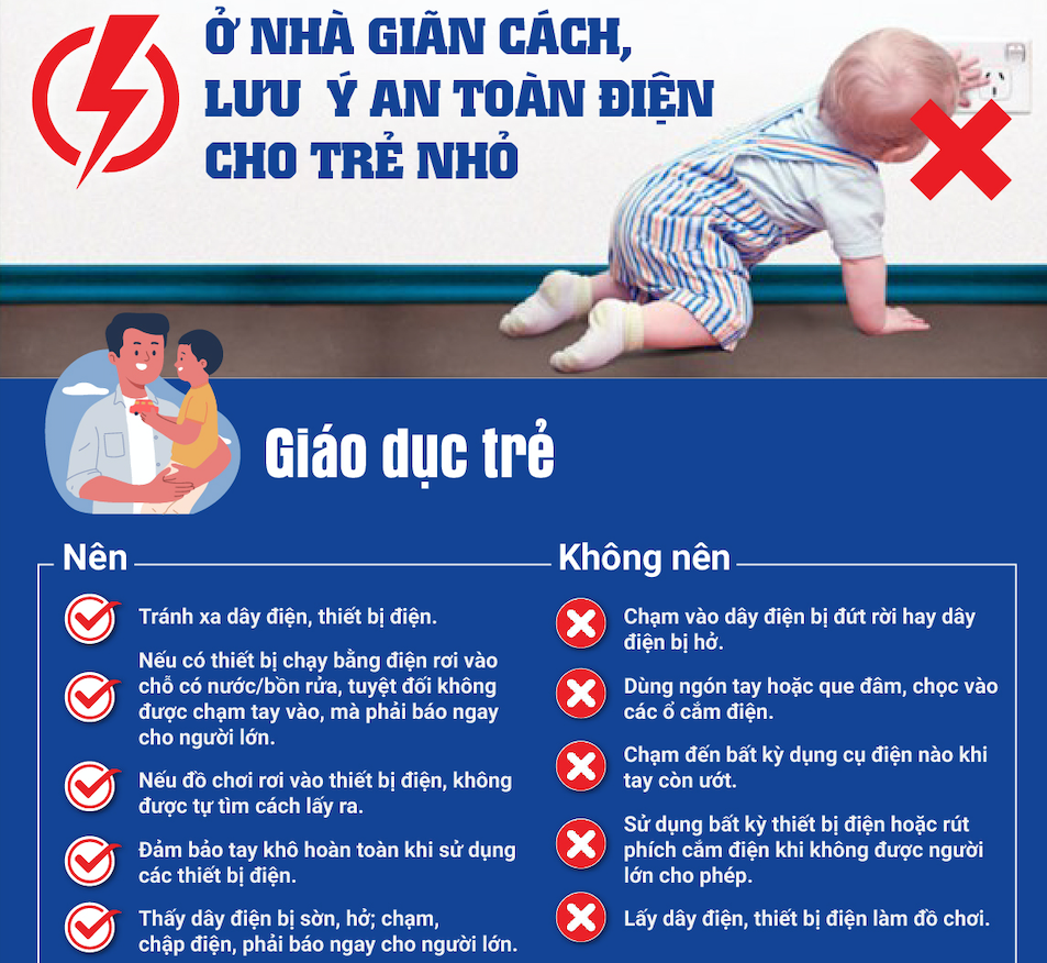 Trong thời gian thực hiện giãn cách xã hội như vừa qua để phòng, chống dịch COVID-19, trẻ em phải ở trong nhà cả ngày, nhiều trẻ phải học online, sử dụng thiết bị dùng điện như máy tính, điện thọai… Với tính hiếu động, thích khám phá của trẻ nhỏ, để đảm bảo an toàn, các bậc cha mẹ nên lưu ý phòng tránh rủi ro tối đa có thể để đảm bảo an toàn điện cho trẻ trong gia đình.
