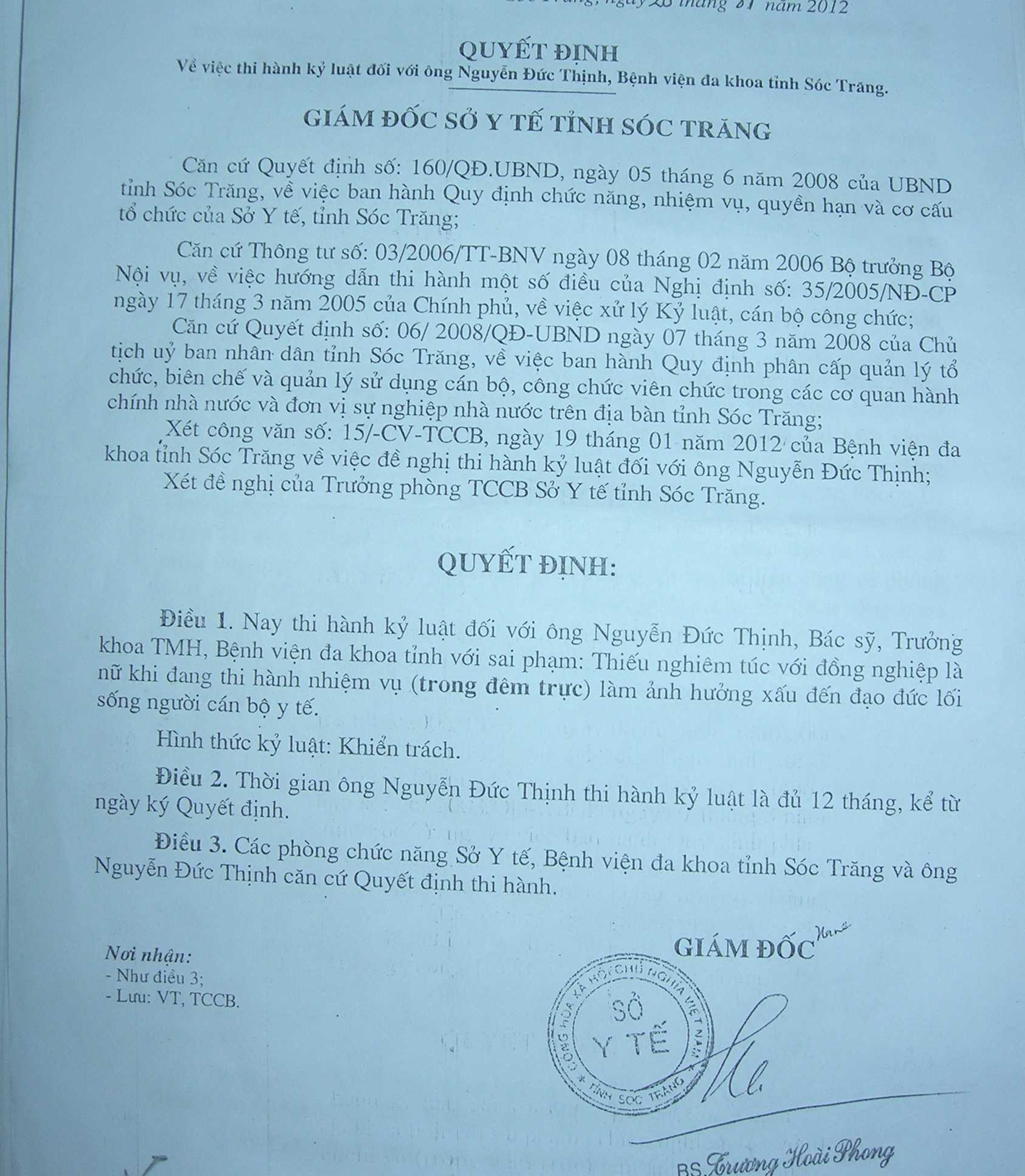 Do đó, ngày 17/1, Bệnh viện Đa khoa tỉnh Sóc Trăng quyết định kỷ luật BS Nguyễn Đức Thịnh, Trưởng Khoa Tai mũi họng với hình thức khiển trách, cắt thi đua một năm vì có hành động không phù hợp với nữ y sĩ khi hai người cùng trực chung trong đêm.Quyết định kỷ luật BS Thịnh của Sở Y tế tỉnh Sóc Trăng. Ảnh: Diễm Hằng.