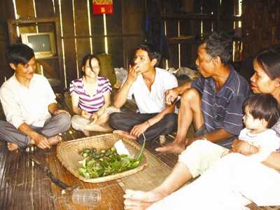 “Nhiều anh em người làng khác nài ép mình uống, mình nhất quyết từ chối. Không uống là không uống. Ai cho mình miếng trầu thì mình thích lắm!”. Cả gia đình già Hai quây quần bên rổ cau trầu, loáng cái đã hết sạch, miệng ai cũng đỏ chót.