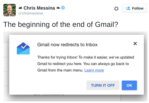 Hiện tại, Google đã gửi thông báo gợi ý chuyển sang dùng Inbox đến nhiều tài khoản Gmail của các nhân vật có tiếng trong giới công nghệ, và ngày càng mở rộng phạm vi người dùng của Inbox. May mắn cho những người dùng còn trung thành với giao diện quen thuộc của Gmail là họ có thể tắt đi dịch vụ này. Tuy nhiên, trong tương lai gần, có thể Google sẽ quyết liệt hơn để thúc ép tất cả người dùng chuyển sang Inbox và vĩnh viễn khai tử Gmail.