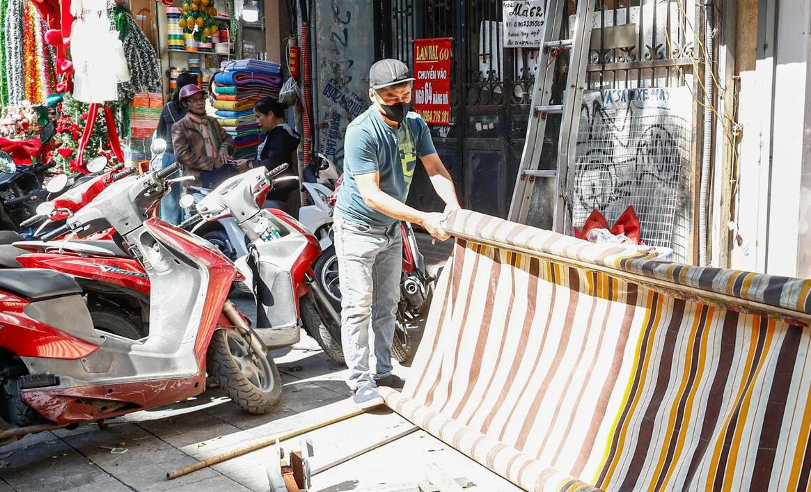 Nhiều mái che và khung sắt cơi nới tồn tại nhiều năm trên các tuyến phố ở phường Hoàn Kiếm đang được người dân phối hợp cùng lực lượng chức năng tháo dỡ. (Ảnh: Minh Đức)