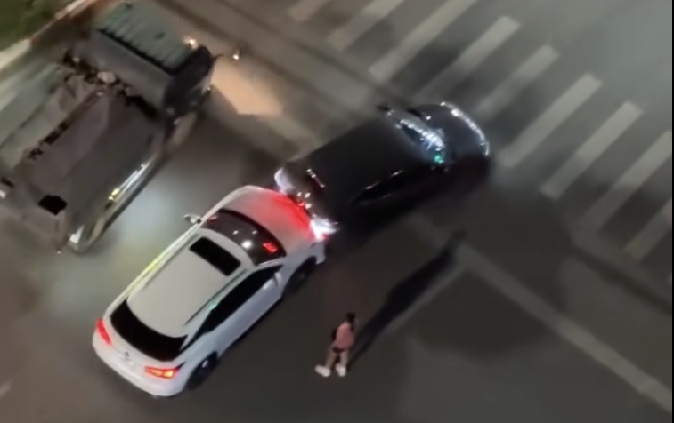 Trong clip, hai tài xế dường như xảy ra tranh cãi, một phụ nữ đứng gần hai phương tiện. Chiếc Lexus bám sát đuôi ô tô màu đen. Một lúc sau, xe Lexus tăng ga, đẩy ô tô màu đen lao về phía trước.