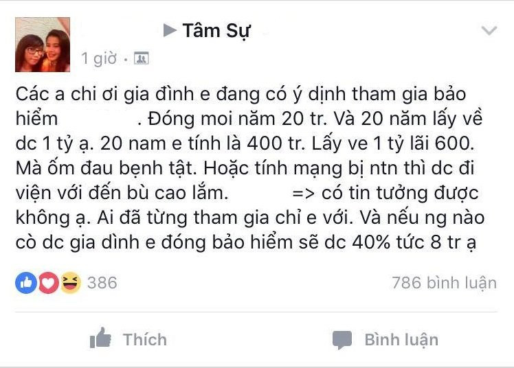 Một facebook có tên T.Đ đã đặt câu hỏi để xin tư vấn: “Các anh chị ơi, gia đình em đang có ý định tham gia bảo hiểm X. Đóng mỗi năm 20 triệu. Và 20 năm lấy về được 1 tỷ ạ. 20 năm em tính là 400 triệu. Lấy về 1 tỷ lãi 600. Mà ốm đau bệnh tật hoặc tính mạng bị như thế nào thì được đi viện với đền bù cao lắm. Có tin tưởng được không ạ? Ai đã từng tham gia chỉ em với. Và nếu người nào được gia đình em đóng bảo hiểm sẽ được 40% tức 8 triệu ạ".