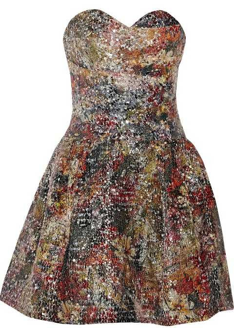 | Đầm cúp ngực xòe gợi cảm cũng là gợi ý lý tưởng cho một bữa tiệc cocktail. Đầm hoa nhiều màu sắc in nhòe đầy nghệ thuật đính sequin càng giúp bạn thêm lộng lẫy và xinh xắn. |