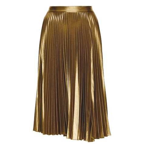 | Đôi khi chỉ cần chiếc váy metallic ánh đồng xếp pli là đủ hòa nhập với xu hướng. Váy midi phối với áo sơ-mi trắng để tới công sở và phối với áo dây trắng để đi quẩy. |