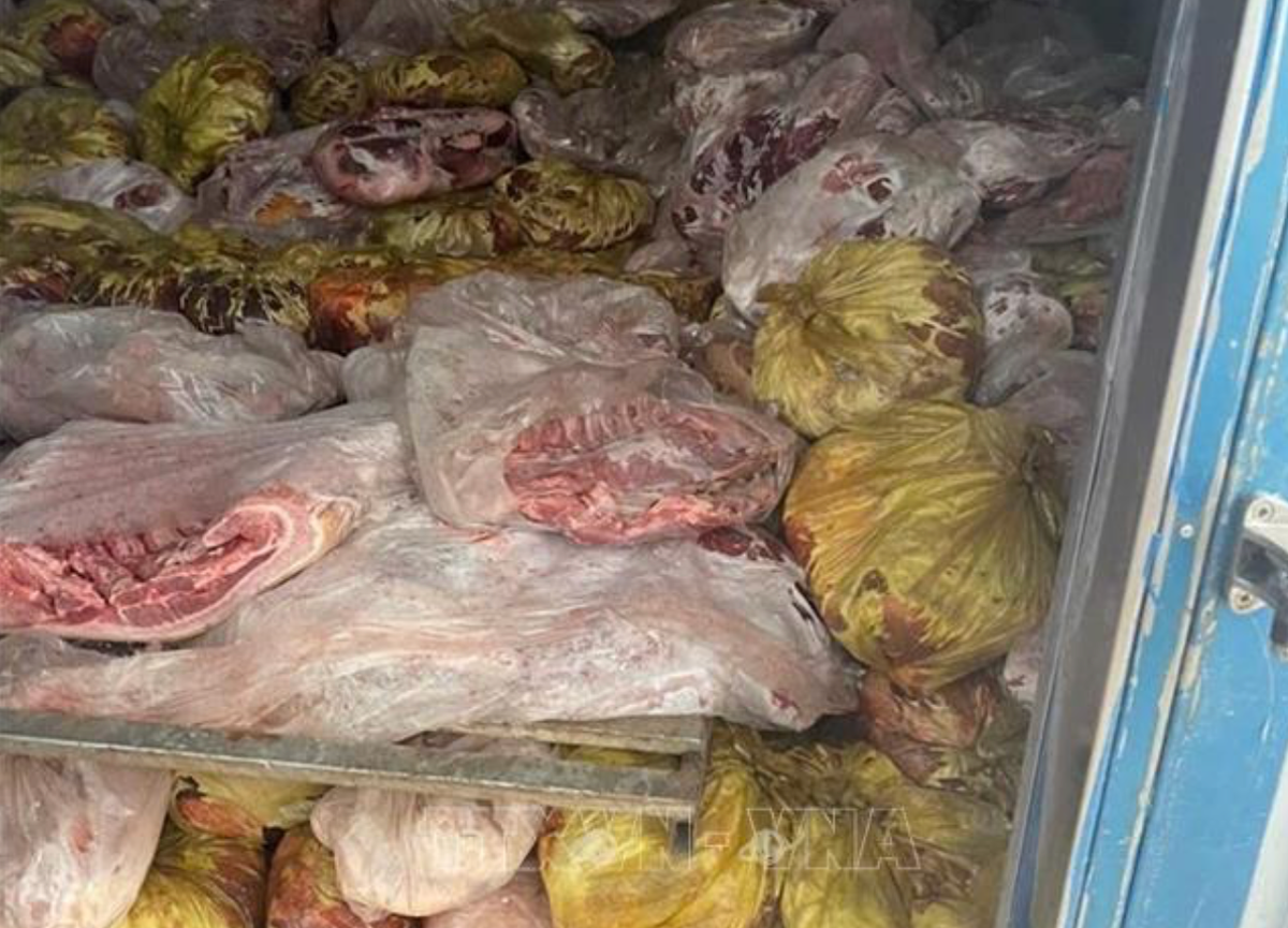 Thịt lợn không rõ nguồn gốc để trong container đông lạnh bị cơ quan chức năng phát hiện. (Ảnh: TTXVN)