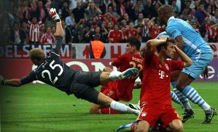 Khi mà nhiều người đã nghĩ tới kết quả hòa không bàn thắng trong hiệp thi đấu thứ nhất thì Mario Gomez bất ngờ tỏa sáng. Phút 38, Ribery đi bóng khó chịu bên hành lang cánh trái rồi tung ra một cú sút cực mạnh. Bóng bật ra khỏi tay Hart tìm đúng chân Muller. Khi mà tiền vệ tuyển Đức còn chưa hết nuối tiếc vì cú sút bị chặn lại thì Gomez xuất hiện kịp lúc đưa bóng vào lưới trống. 1-0 cho Bayern. (xem clip bàn thắng)
