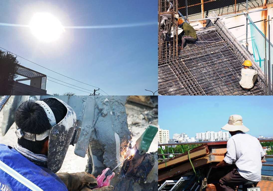 Dưới trời nắng nóng như thiêu như đốt, những công nhân chuyên làm sắt thép làm việc trên cao lại càng vất vả.