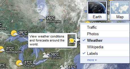 Người dùng có thể tuỳ chỉnh bảng điều khiển bên trái để bật lên hoặc tắt chế độ xem mây vệ tinh khi phóng đại bản đồ. Về mặt địa lý, các khu vực đang trong thời gian ban ngày được đánh dấu mặt trời và ban đêm là hình mặt trăng.