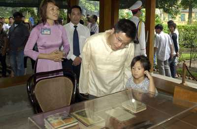 | Giáo sư Ngô Bảo Châu và con gái anh bên những kỷ vật của Bác Hồ. |