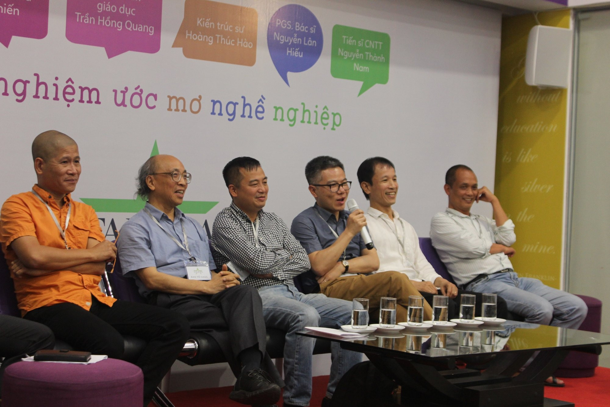 GS Ngô Bảo Châu và các khách mời tại buổi định hướng nghề nghiệp cho con. (Ảnh: Lưu Ly)
