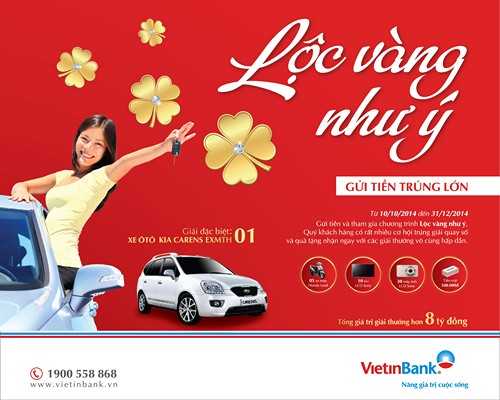 Từ ngày 10/10/2014 đến ngày 31/12/2014, VietinBank triển khai chương trình khuyến mãi tiền gửi 'Lộc vàng như ý' với ba cơ hội trúng thưởng giá trị. ![]() |
