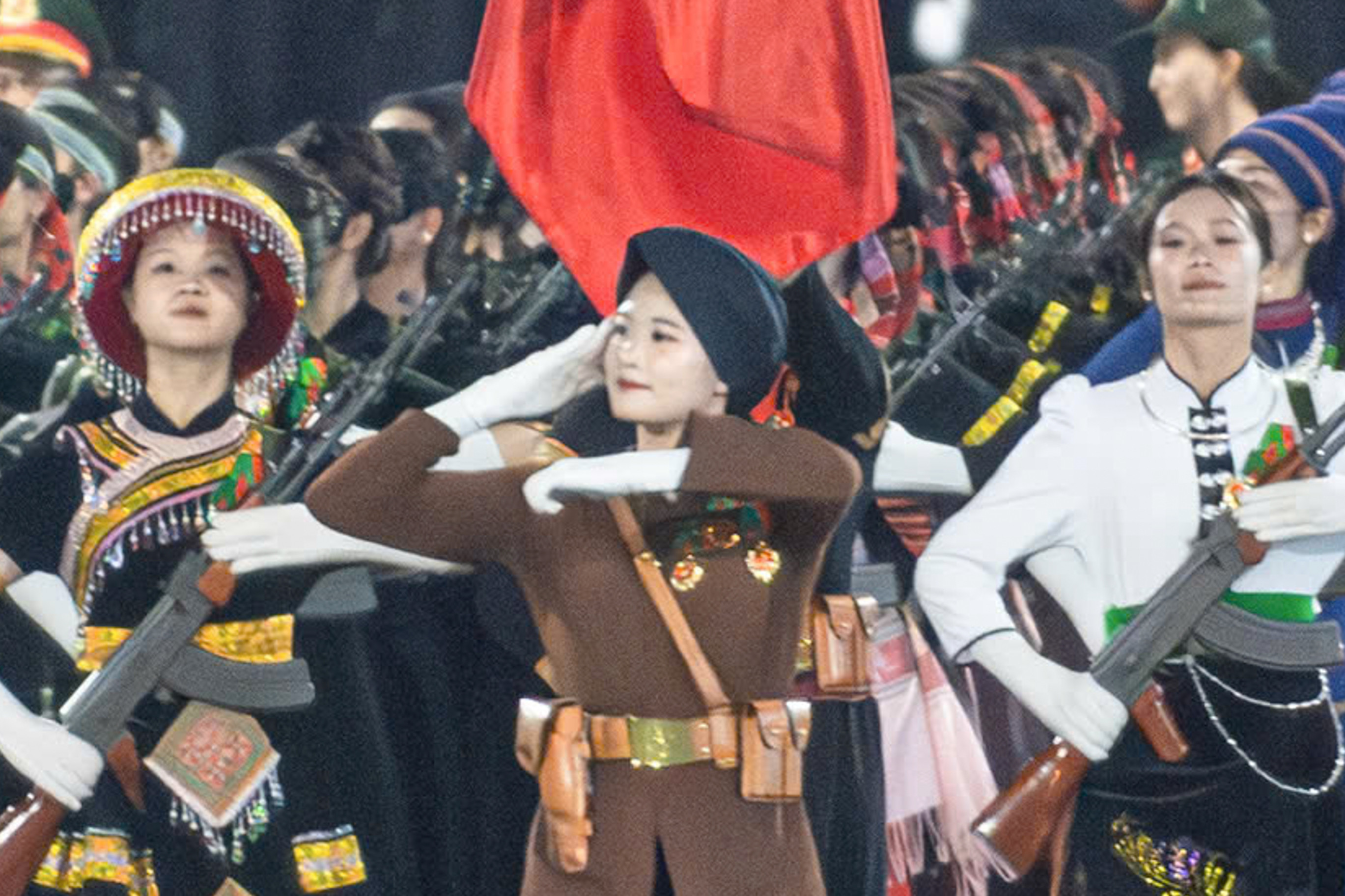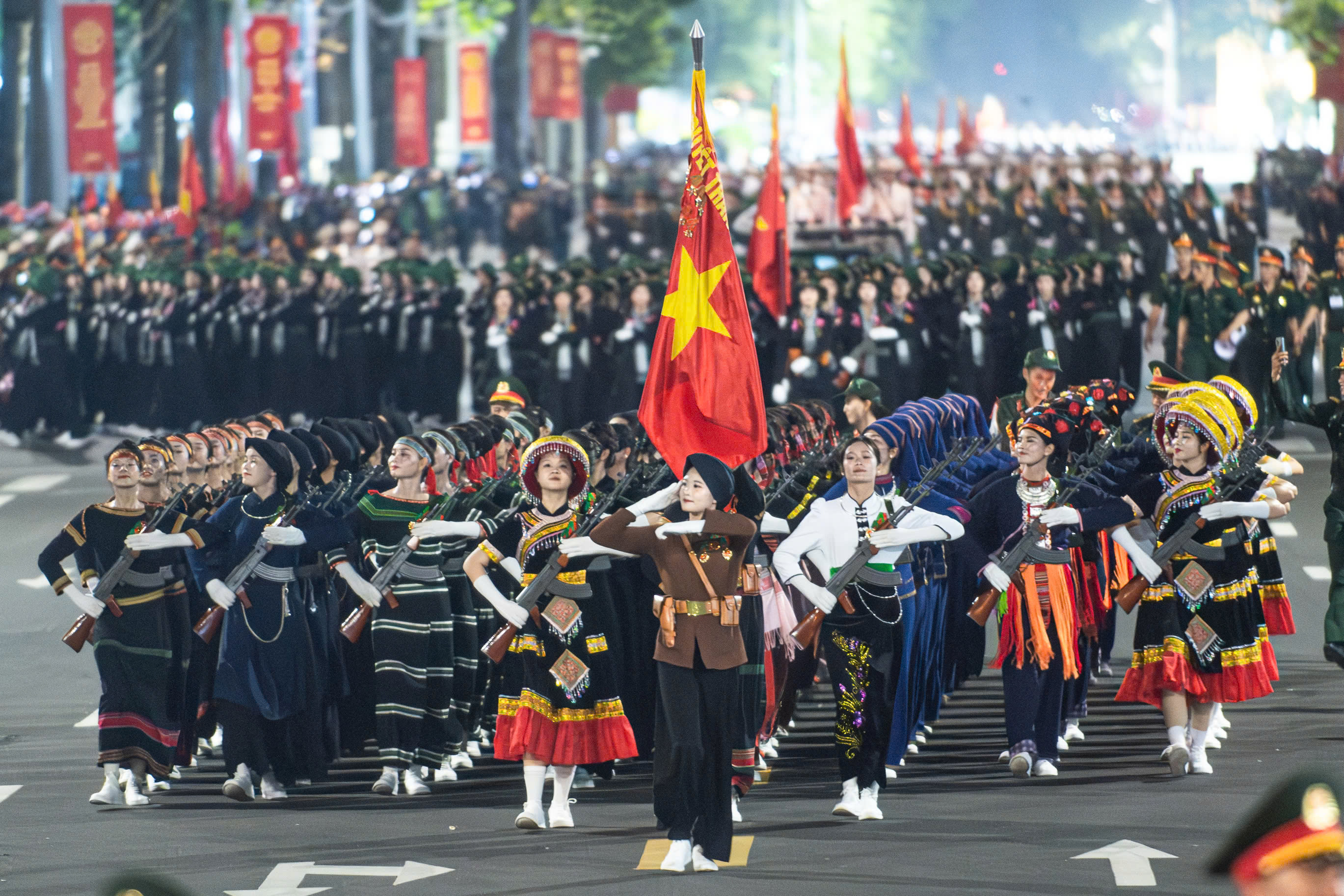 Khối nữ Dân quân các dân tộc Việt Nam khoác lên mình nhiều bộ trang phục truyền thống rực rỡ, tượng trưng cho tinh thần đoàn kết của 54 dân tộc anh em.