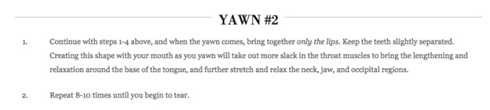 1. Làm theo hướng dẫn từ bước 1 - 4 như trên, khi ngáp thì mím môi lại, giữ hai hàm răng không chạm vào nhau. Việc tạo ra tư thế ngáp này sẽ tạo thêm nhiều chỗ trùng cho cơ miệng để kéo dài sự thư giãn xung quanh lưỡi, thêm vào đó tư thế này còn giúp kéo giãn và thả lỏng cổ, cơ hàm và vùng chẩm.